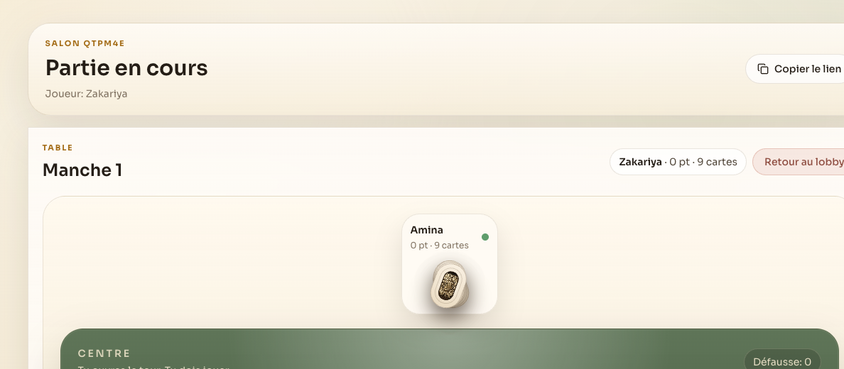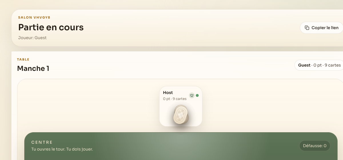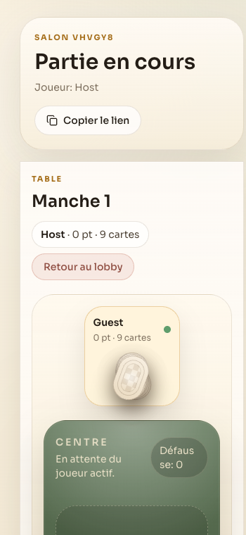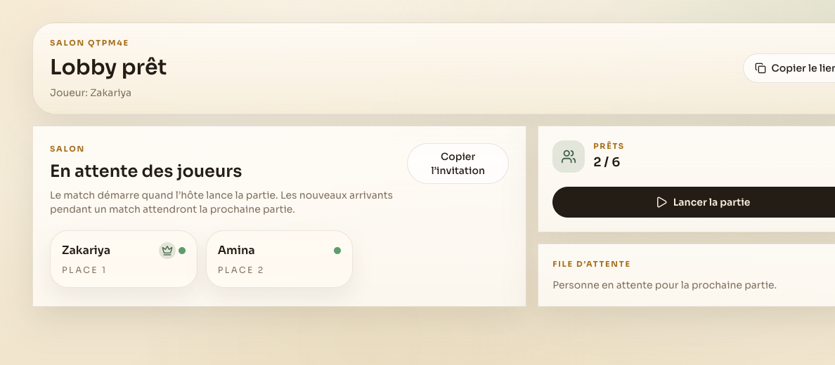 Tu crées un salon, tu partages le lien, les joueurs arrivent et la table est déjà claire.