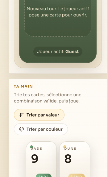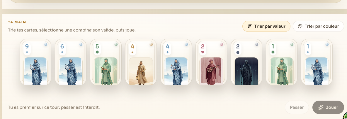 Pour jouer plusieurs cartes, elles doivent matcher. Le tri par valeur ou couleur te fait lire les combos instantanément.